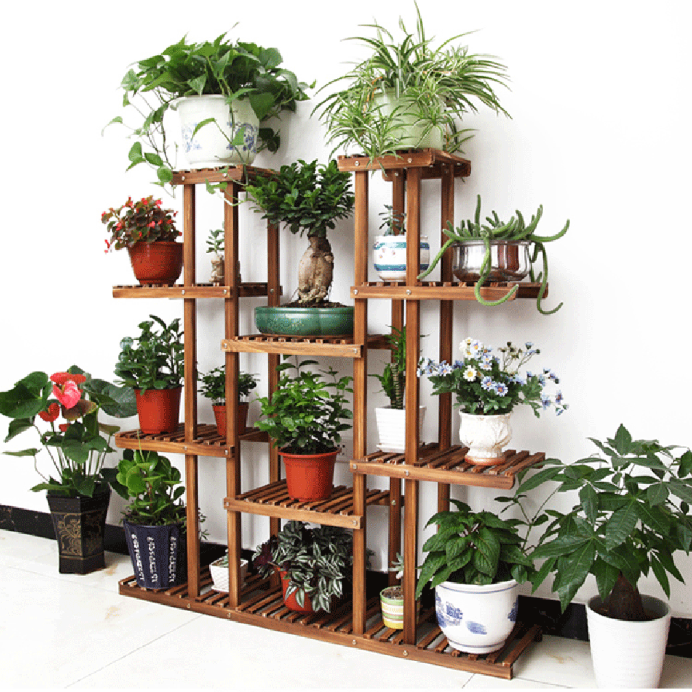 - High and low level wooden flower racks can hold VARIOUS SIZES potted plants AT LEAST 17 POTS, collectibles. Vertical design creates helps plants get enough sunlight for growth. 115cm width extends the large area with ground, which is more sturdy. 25cm depth, space saving, available for place in corner, also allows for 2 row of potted flowers. Assemble required but easy. Install tools and manual included in the package with extra screws.